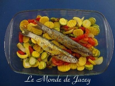 Eine Auflaufform ölen und mit den Knoblauchzehen einreiben. Gemüse einfüllen und die Fische oben auf legen.