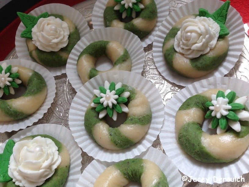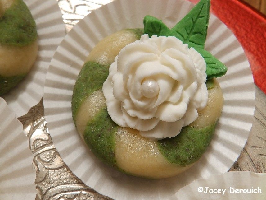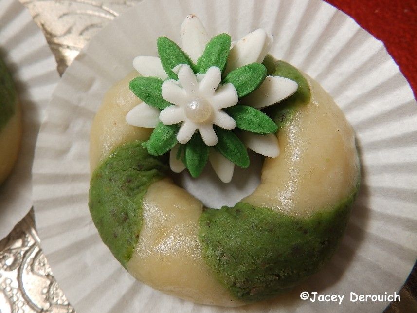 Marzipanrohmasse mit 125g Puderzucker und etwas Rosenblütenwasser ebenfalls zu einem Teig verkneten.