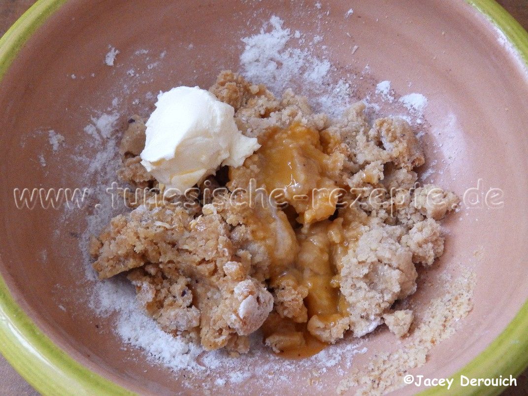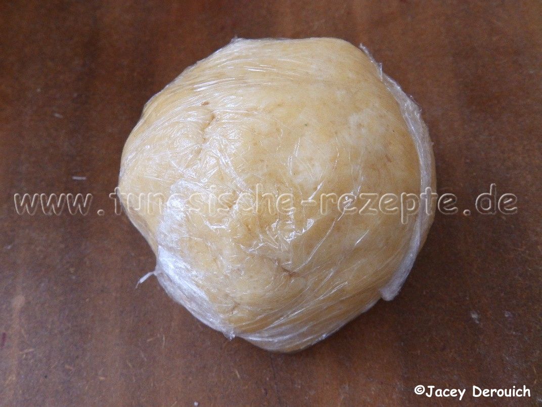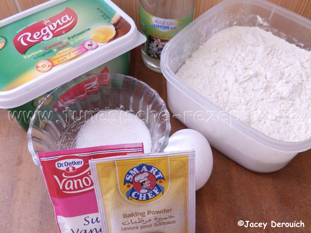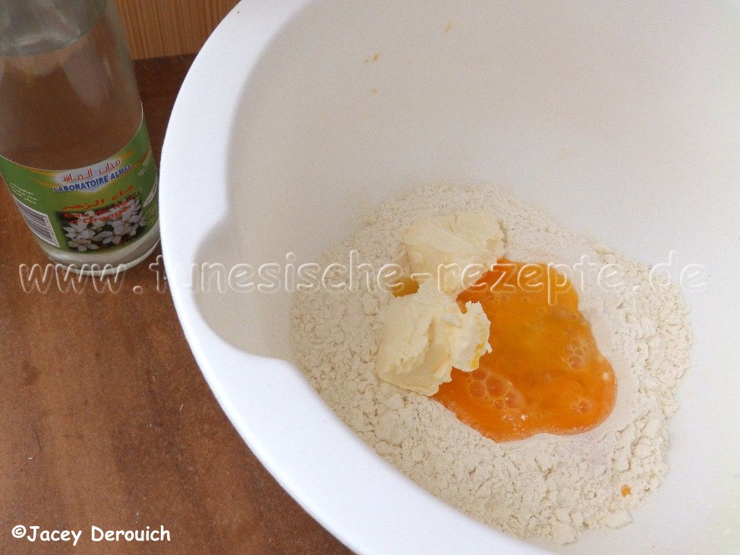 Das Mehl sieben, eine Mulde bilden und dort hineinen das Ei, den Zucker, den Vanillezucker, 100g Margarine und eine Prise Backpulver geben. Alles vermischen und unter Zugabe von etwas Orangenblütenwasser einen Teig kneten. Bei Bedarf noch ganz wenig Wasser zufügen.