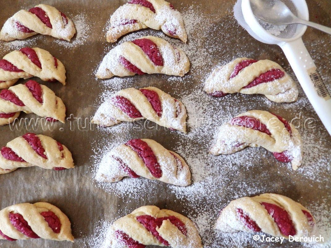 Auf ein Backblech mit Backpapier legen und im vorgeheizten Backofen bei 170-180 Grad Ober- Unterhitze backen, bis das Hörnchen auf der Unterseite leicht gebräunt ist. Zur Sicherheit auch ein Stück aufbrechen, und schauen ob der Keks von innen durch gebacken ist.