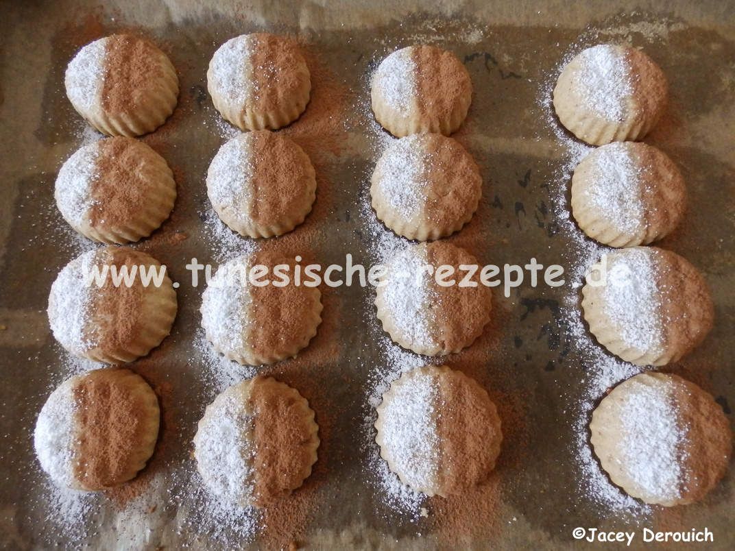 Mit Puderzucker und/oder Kakaopulver bestäuben und mit Cashewkernen dekorieren. Diese kann man zum Beispiel mit einem Tropfen flüssiger Schokolade ankleben.