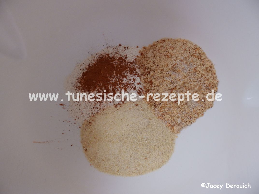 Grieß, Mehl, Mandeln und einen Teelöffel Zimt mischen.