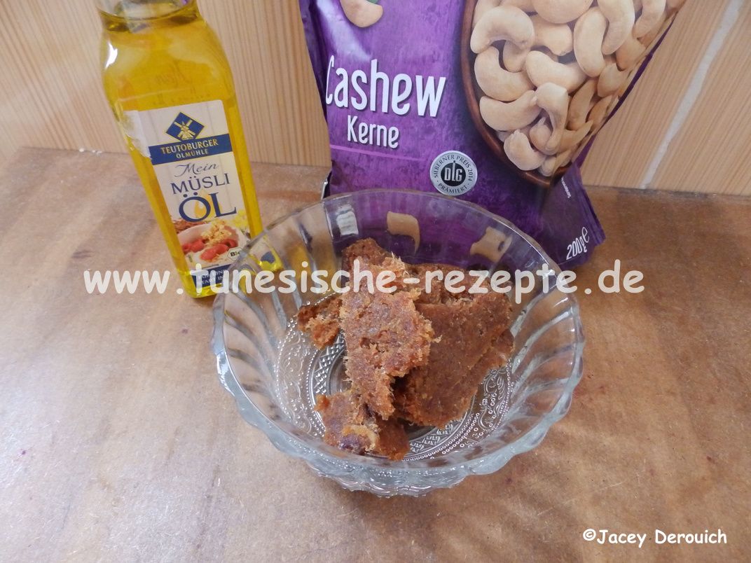 Cashewkerne rösten und in einem Mixer mit 1 Esslöffel Öl und einer Prise Salz zu einer Butter verarbeiten. Diese dann mit der Dattelpaste gut vermengen, so dass ein formbarer Teig entsteht.