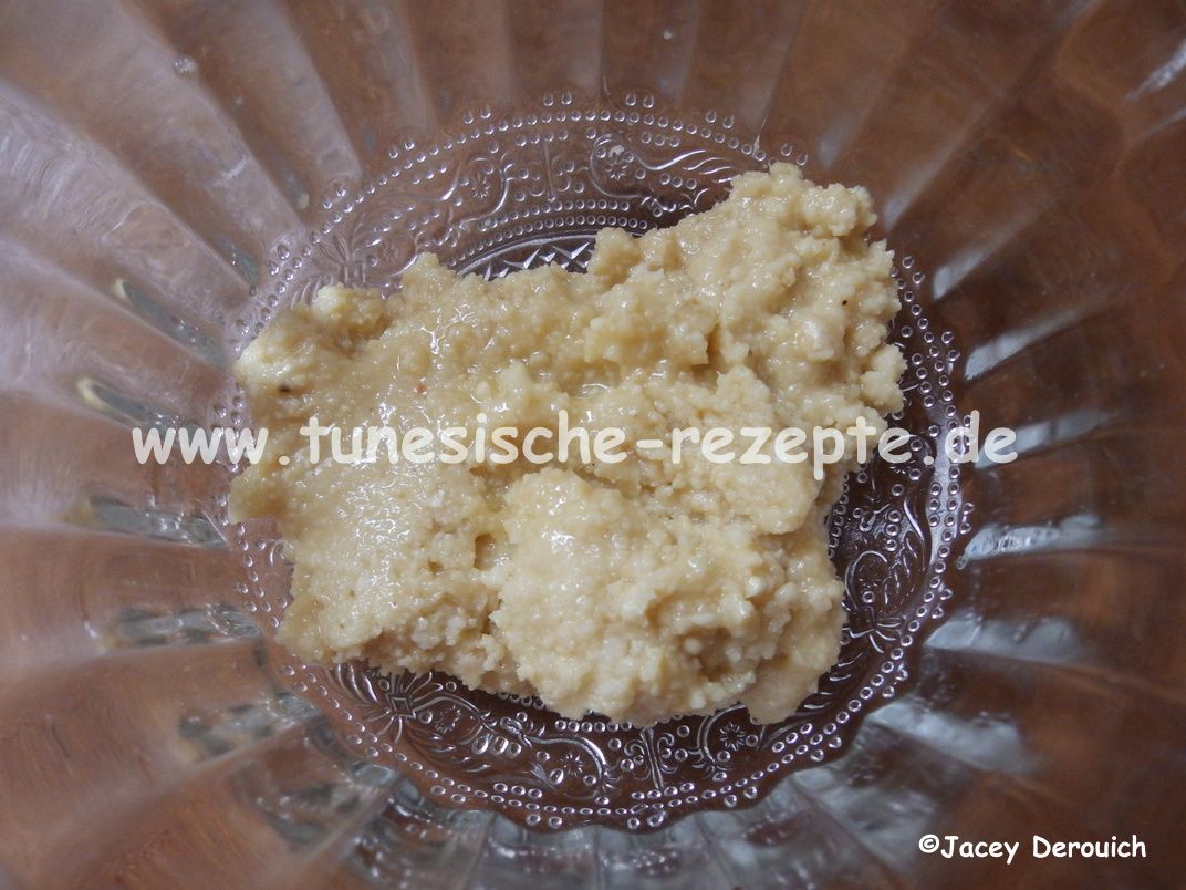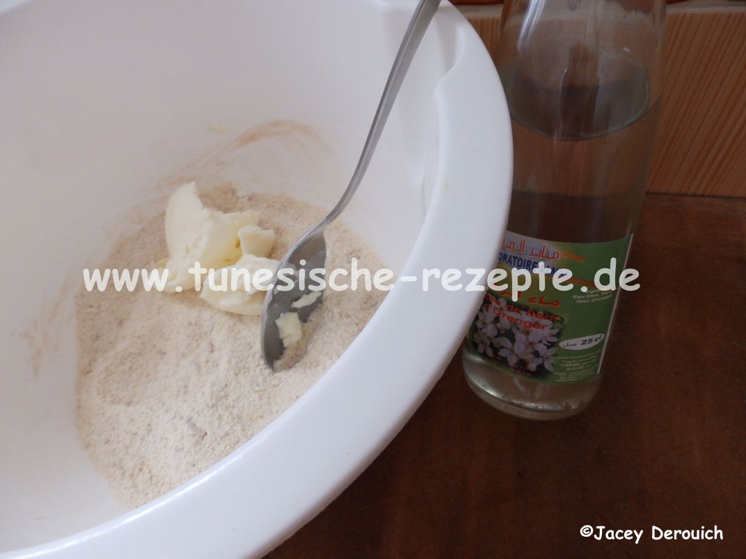 Margarine untermengen und die gezuckerte Kondensmilch und einen Esslöffel Orangenblütenwasser zufügen.