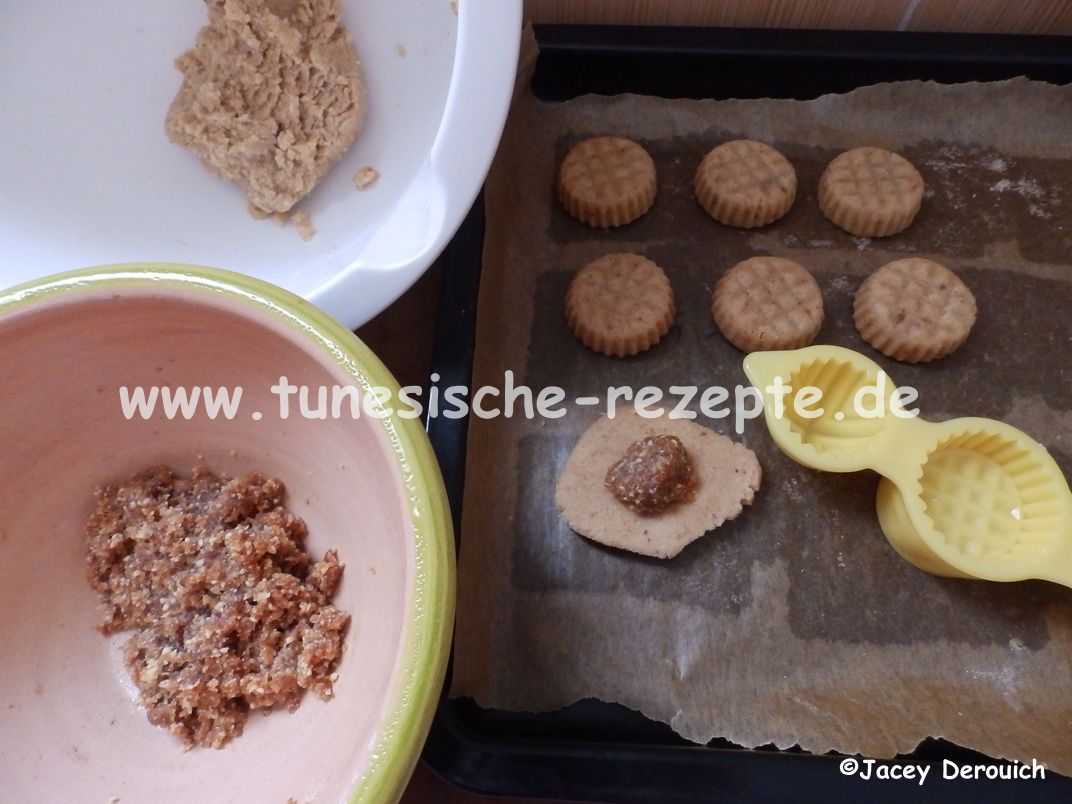 Aus dem Maamoulteig kleine Kugeln formen und diese etwas platt drücken. Eine kleine Kugel Füllung hinein geben und diese mit dem Teig umschließen.