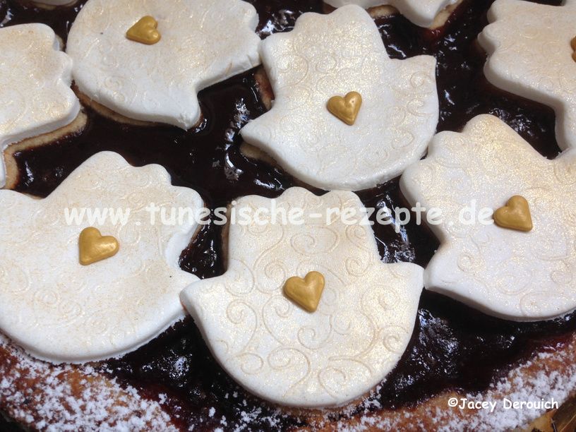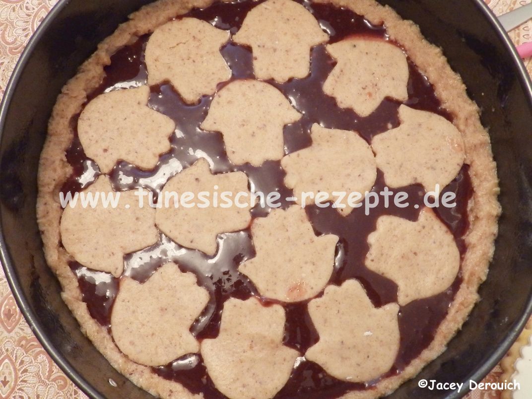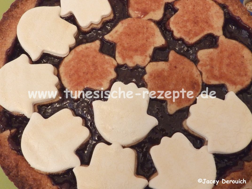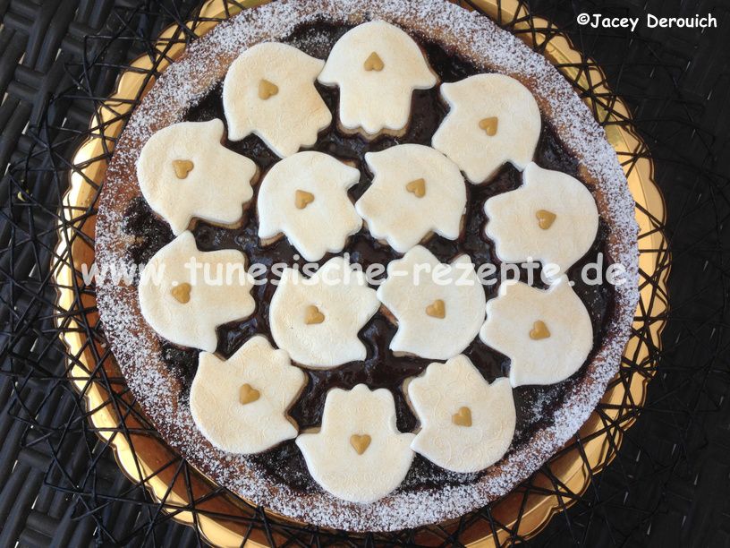 Den Kuchen wie in dem 1001 Nacht Rezept vorbereiten. Anstatt Palmen und Kamele werden nun Fatimahände ausgestochen und auf die Marmeladenschicht gelegt.